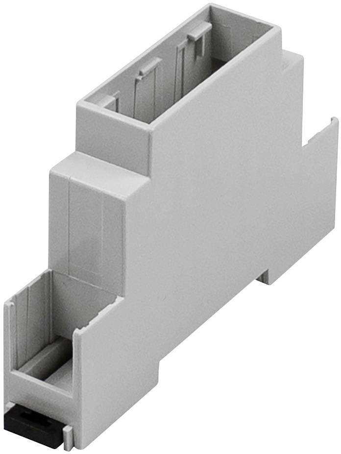 Modulares Hutschienengehäuse der Serie CNMB mit langer Wand für zusätzlichen Schutz optional mit Deckel und Klemmenabdeckungen. Das Gehäuse bietet verschiedene Möglichkeiten Leiterplatten zu integrieren: Mit Hilfe von Führungsschienen können bis zu 3 Leiterplatten in der Horizontalen uns bis zu 2 Leiterplatten in der Vertikalen angebracht werden. Mit Hilfe von Befestigungsdomen in der Bodenplatte des Gehäuses können die Leiterplatten zusätzlich fixiert werden.