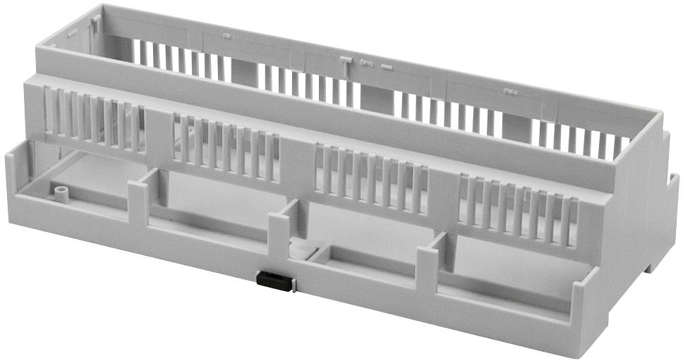 Modulares Hutschienengehäuse der Serie CNMB mit Lüftungsschlitzen für eine optimale Luftzirkulation optional mit Deckel und Klemmenabdeckungen. Das Gehäuse bietet verschiedene Möglichkeiten Leiterplatten zu integrieren: Mit Hilfe von Führungsschienen können bis zu 3 Leiterplatten in der Horizontalen uns bis zu 2 Leiterplatten in der Vertikalen angebracht werden. Mit Hilfe von Befestigungsdomen in der Bodenplatte des Gehäuses können die Leiterplatten zusätzlich fixiert werden.
