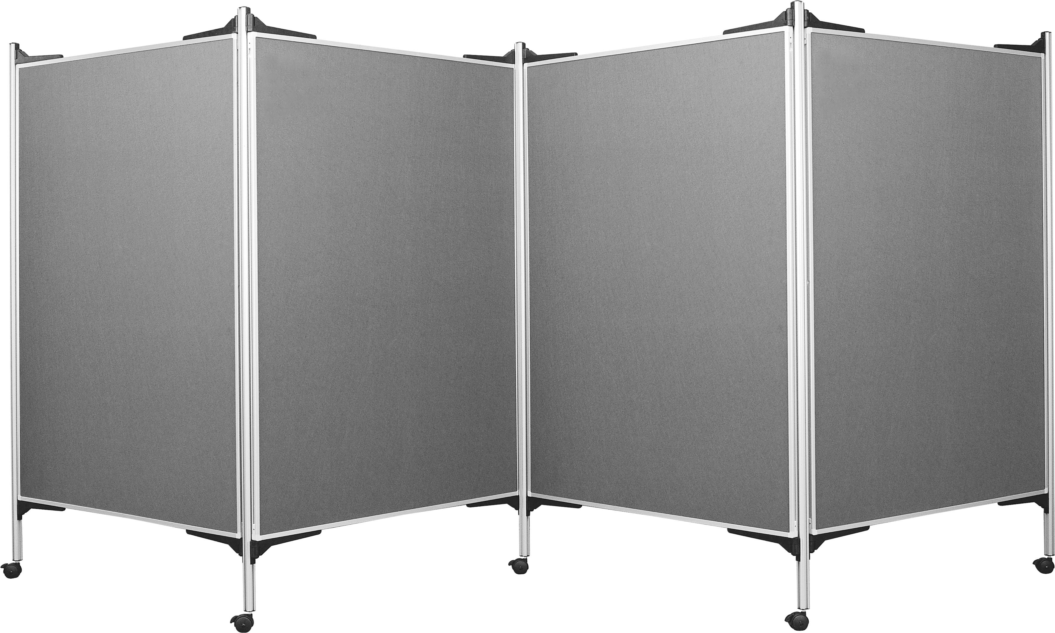 Das mobile, hochwertige Stellwand-System für eine kommunikative Raumgestaltung. Zur dauerhaften Nutzung mit hoher Flexibilität: Doppelseitige Pinnwände zur Kommunikation, Präsentation + Information. Ideal für Empfangs-Bereiche, Hotels, Theater, auf Messen + Ausstellungen. Auch als optische und funktionale Raumteiler flexibel einsetzbar. Durch die Vierkantsäulen lassen sich die Tafeln auch im rechten Winkel oder kreisförmig einhängen. Somit sind verschiedene Stell-Varianten möglich. Tafeln hoch + quer einhängbar. Hochwertige, pinnbare Oberfläche: Filz grau. Mobil durch feststellbare Laufrollen. Wände lassen sich ganz einfach zusammenschieben und sind so auf engstem Raum lagerbar. Set 2 mit 4 x Pinnwänden im Aluminium-Systemrahmen, beidseitigem Filz grau, 5 x Vierkantsäulen mit arretierbarem Laufrollen. Größe je Wand: 1200 x 1500 mm.