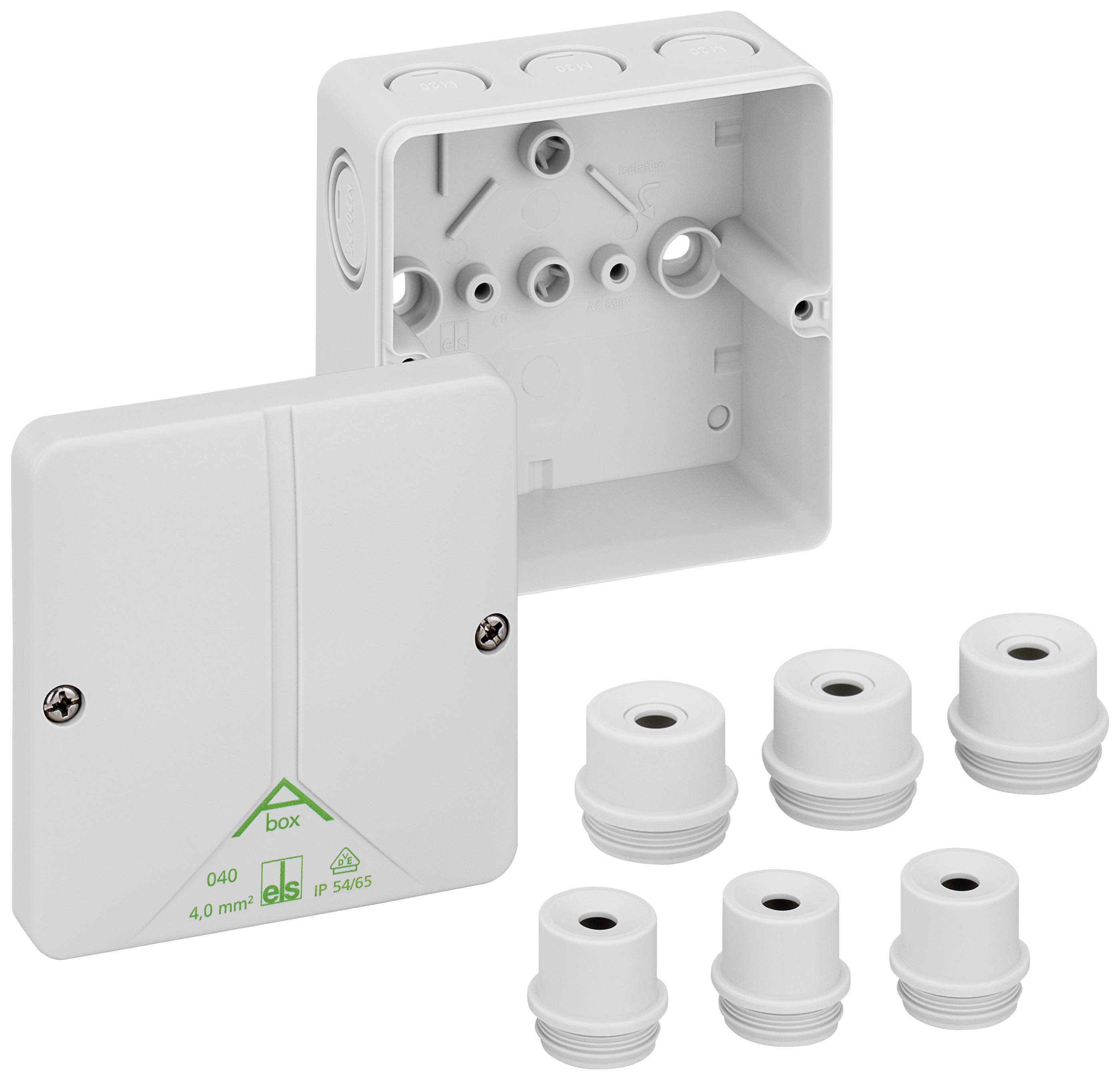 Verbindungsdose nach DIN EN 60670 (VDE 0606), Ui=690V, mit Vorprägungen, mit IP54 Anbaustutzen, M20, M20/M25, Dichtbereich 8 - 13,5 mm, Dichtbereich 9 - 18,5 mm.