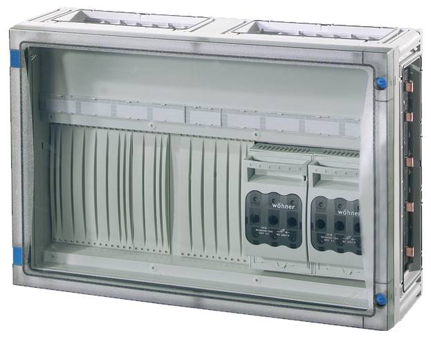 Gehäuse mit Tür für den Bau von Installationsverteilern bis 250 A für die Bedienung durch Laien nach IEC 61439-3. Offene Gehäusewände für die Kombination oder als Einzelgehäuse mit Verschlussplatten. Aus hochwertigem Polycarbonat, schutzisoliert. Schnelle Gehäuseverbindung durch Steckverbinder und integrierte Dichtungen. Große Wanddurchführungen für die elektrische Verbindung der Gehäuse untereinander. Kabeleinführung über Flansche. Wandbefestigung direkt am Gehäuse, über Außenlaschen oder mit Montageschienen. Gehäuse mit 2 x Sicherungslasttrennschalter NH 00C, 3-polig, nach IEC 60947-3 auf Sammelschienen. Mit Zuleitungsklemmen, PE- und N-Klemmen und Berührungsschutz. Anschlussrichtung veränderbar. Mit transparenter Tür und Türverschluss mit Werkzeugbetätigung.