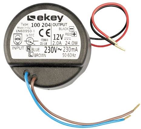 Das ekey Netzteil Unterputz mit 230 VAC Eingangsspannung, 12 VDC Ausgangsspannung und 2 A Ausgangstrom versorgt die ekey Geräte mit der benötigten elektrischen Energie. Dieses Netzteil ist für die Verwendung im Heim- und Gewerbebereich vorgesehen. Das ekey Netzteil Unterputz ist für die ortsfeste Unterputzmontage an unbeweglichen Teilen wie Unterputzdosen und für den Einsatz im geschützten Innenbereich vorgesehen.