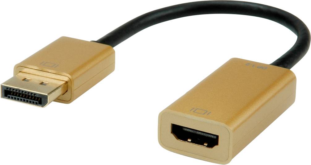 ROLINE GOLD DisplayPort zu HDMI Kabeladapter zum Anschluss von beispielsweise einer Grafikkarte mit DP an einen Monitor mit HDMI Anschluss - mit einer Auflösung von bis zu 3840x2160 @30Hz! Adapter(aktiv) mit DisplayPort-Stecker und HDMI-Buchse - zum Anschluss eines HDMI-Kabels (ST-ST) an eine DisplayPort-Buchse der Grafikkarte DisplayPort Version 1.2 erlaubt höhere Auflösungen und Bildwiederholraten sowie größere Farbtiefen. Hinweis: Der DisplayPort-HDMI-Adapter funktioniert nur in einer Richtung: der DisplayPort-Stecker ist nur auf der Datenquellenseite verwendbar(z.B. Grafikkarte). Was sind die Vorteile beim Verwenden eines aktiven Adapters? Aktive Adapter sollten dann eingesetzt werden, wenn Sie längere Kabel verwenden. Das Bildsignal wird im Adapter elektronisch umgewandelt und verbessert Ihr Bild. ROLINE GOLD - Topqualität ohne Kompromisse! Kabel in ROLINE GOLD-Qualität verfügen über hochwertige Steckergehäuse und vergoldete Steckkontakte mit zweifacher Abschirmung für eine bessere Signalqualität auch bei hohen Steckzyklen. Der Nylonmantel in gold/schwarz sorgt für eine bessere Stabilität und verleiht dem Kabel eine außergewöhnliche Optik.