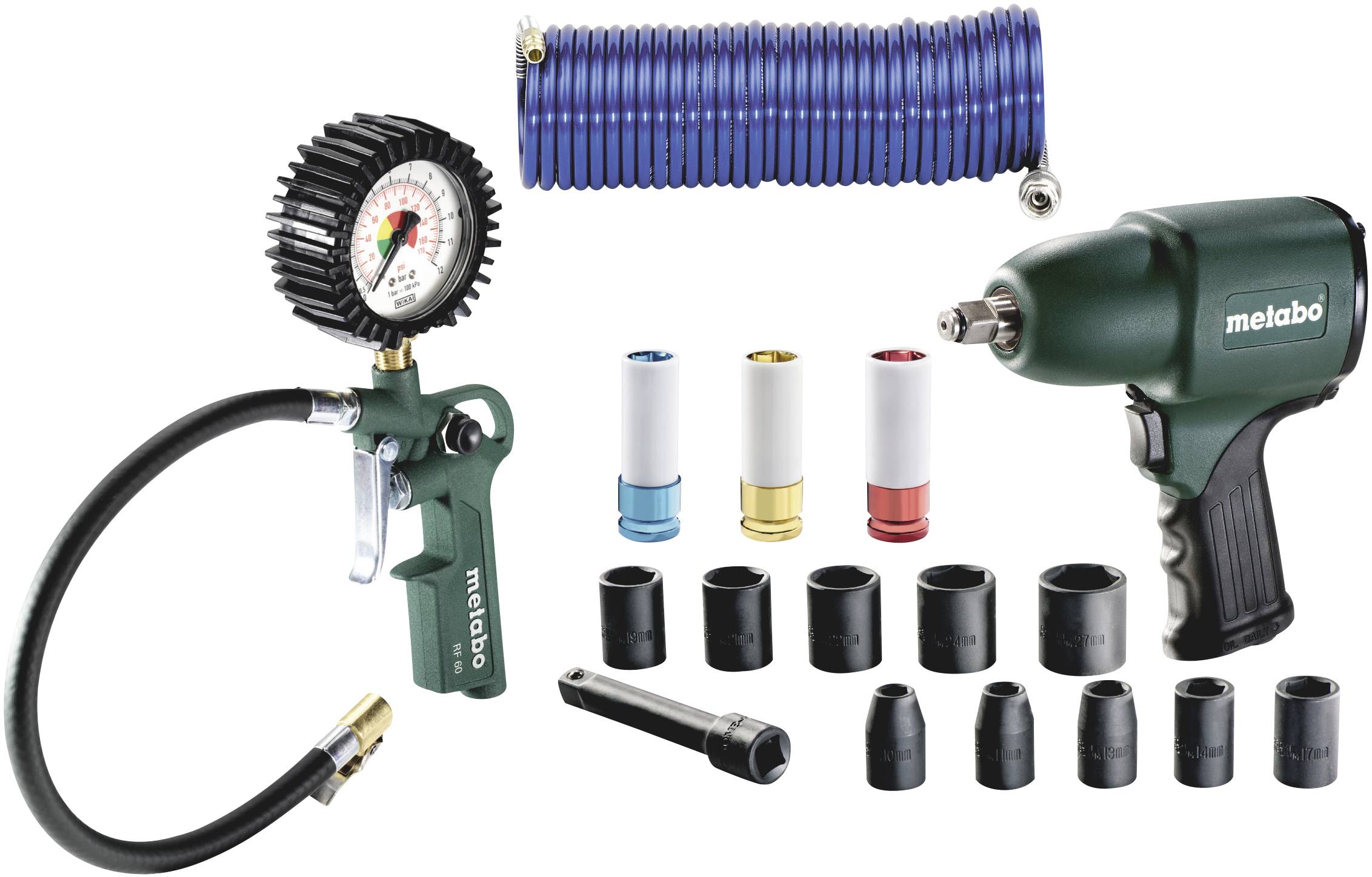 DSSW 360, RF 60, Schlagschrauber-Steckschlüsselsatz 1/2 KFZ, 3-tlg.”, 10 Steckschlüssel (10, 11, 13, 14, 17, 19, 21, 22, 24, 27 mm), Verlängerungsaufsatz, Spiralschlauch,PA Euro 6 mm x 8 mm / 5 m