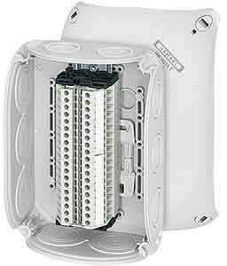 Kabelabzweigkasten aus hochwertigem Thermoplast mit Reihenklemmen für Aluminium- und Kupferleiter. Für Aufputz-Anwendungen in Gebäuden oder die geschützte Installation im Freien. Mit Außenlaschen zur Befestigung und Deckelbefestigung über Schnellverschlüsse. Mit Deckelhalteband. Mit 19 Reihenklemmen bis 4 mm². Kabeleinführung über elastische Dichtmembranen in Gehäusewänden und Boden. Nachträglicher Einsatz von Kabelstutzen durch Entfernen der Dichtmembrane möglich.