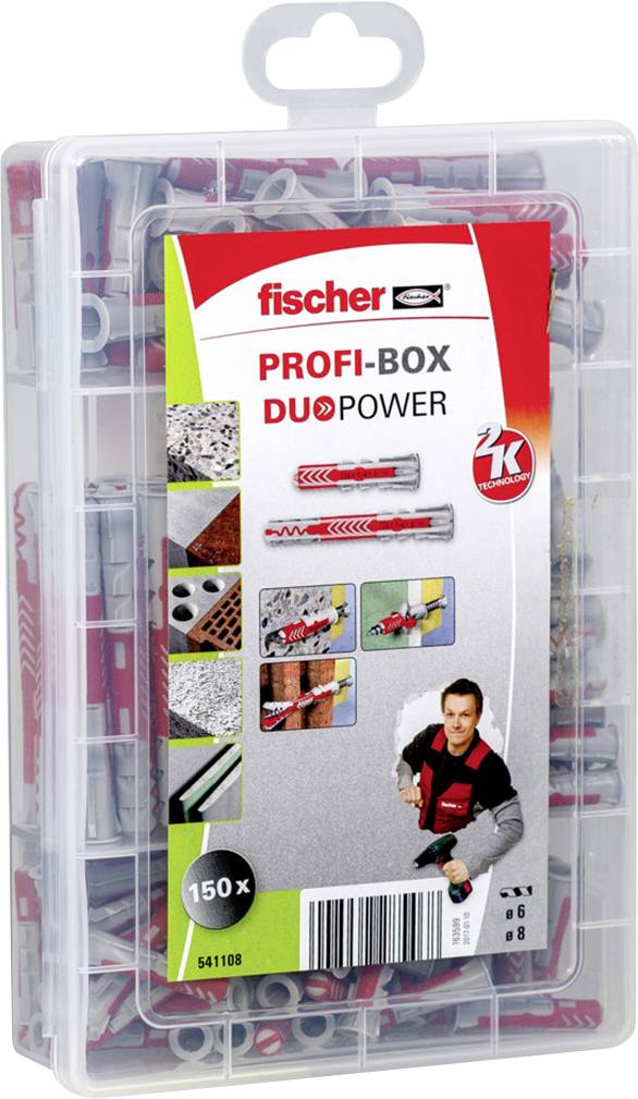 Die fischer PROFI-BOX DUOPOWER enthält vorsortierte 60 DUOPOWER 6 x 30, 40 DUOPOWER 8 x 40 sowie 30 DUOPOWER 6 x 50 und 20 DUOPOWER 8 x 65. Die MEISTER-BOX aus hochwertigem und schlagfestem Kunststoff, ist ideal für Werkstatt und Baustelle. Der transparente Deckel gibt einen Überblick auf einen Blick. Die fischer MEISTER-BOX schließt sicher und kann mit Stopfen nachgefüllt werden.