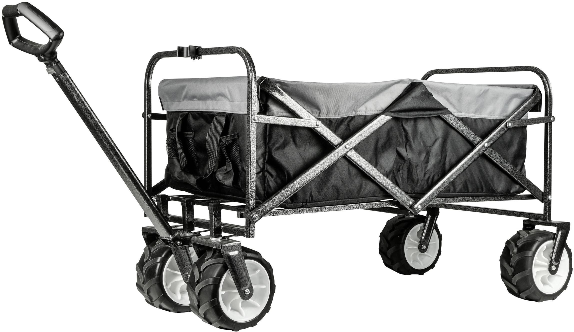 Mit 4 extra breiten Rädern (10cm, Durchm. 18 cm), zusammenklappbar, stabiles Stahl-Gestell mit Komfort-Griff u. Zwangslenkung für leichtes manövrieren.