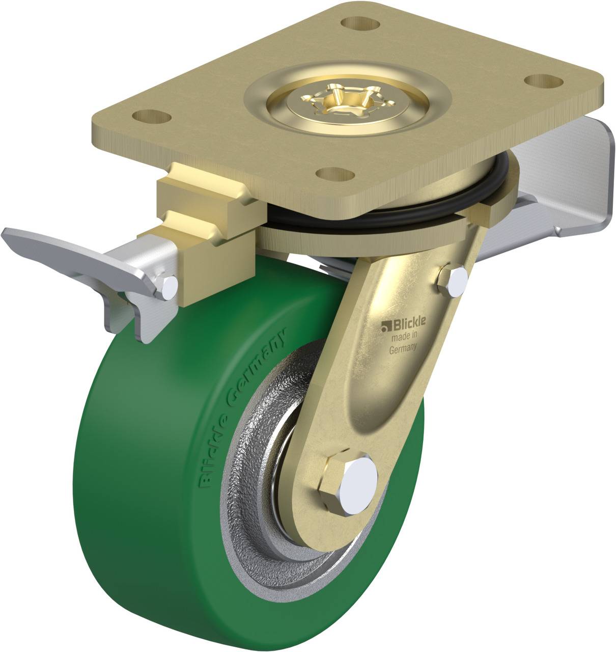 • Laufbelag: hochwertiges Polyurethan-Elastomer Blickle Softhane®, Härte 75 Shore A, Farbe grün, spurlos, kontaktverfärbungsfrei