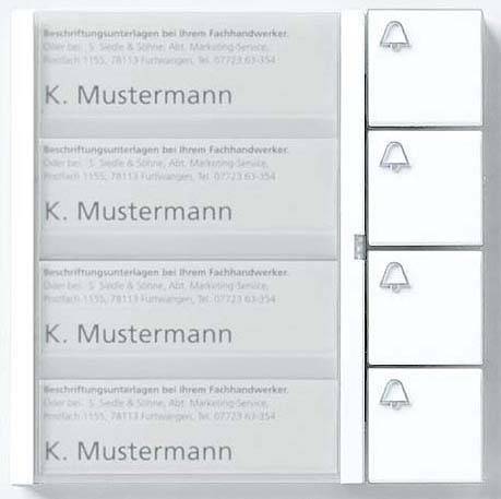 Bus-Tasten-Modul mit Namensschildtasche, 4 Namensschildern und 4 separaten Ruftasten mit Glockensymbol.