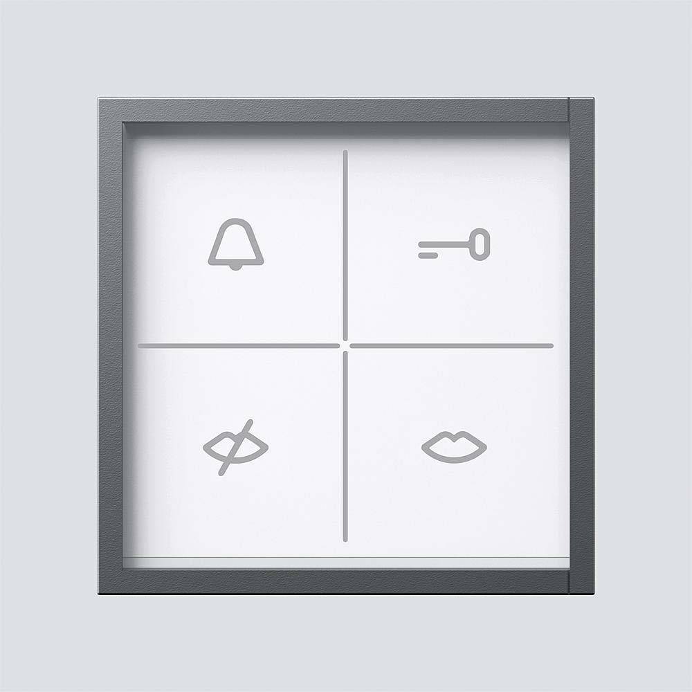 Zustandsanzeige-Modul mit optischer und akustischer Rückmeldung. Jeweils ein LED-hinterleuchtetes Symbol signalisiert die Zustände Ruf, Nicht erreichbar, Sprechen und Türöffnen. Für den Einsatz im Sprechsystem Siedle Access Professional.