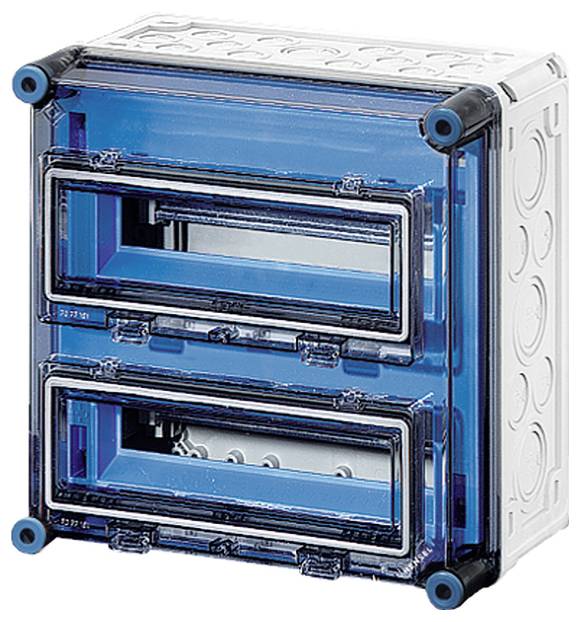 Gehäuse für den Bau von Energie-Schaltgerätekombinationen bis 630 A oder als Einzelgehäuse. Aus hochwertigem Polycarbonat schutzisoliert. Wanddurchführungen mit großen Öffnungen für die elektrische Verbindung der Gehäuse untereinander. Kabeleinführung an allen Gehäusewänden über metrische Vorprägungen oder Anbauflansche. Gehäuse zur Wandbefestigung auch über Außenlaschen oder mit Montageschienen. Automatengehäuse mit 24 Teilungseinheiten zum Einbau von Reiheneinbaugeräten nach DIN 43880. Ohne PE- und N-Klemmen. Mit Abdeckstreifen zum Verschließen von nicht benutzten Geräteausschnitten und Beschriftungsstreifen für die Stromkreiskennzeichnung. Transparente Klappdeckel, mit Zubehör abschließbar. Deckelverschlüsse für Handbetätigung.
