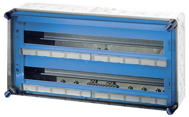 Gehäuse für den Bau von Energie-Schaltgerätekombinationen bis 630 A oder als Einzelgehäuse. Aus hochwertigem Polycarbonat schutzisoliert. Wanddurchführungen mit großen Öffnungen für die elektrische Verbindung der Gehäuse untereinander. Kabeleinführung an allen Gehäusewänden über metrische Vorprägungen oder Anbauflansche. Gehäuse zur Wandbefestigung auch über Außenlaschen oder mit Montageschienen. Automatengehäuse mit 56 Teilungseinheiten zum Einbau von Reiheneinbaugeräten nach DIN 43880. Ohne PE- und N-Klemmen. Mit Abdeckstreifen zum Verschließen von nicht benutzten Geräteausschnitten und Beschriftungsstreifen für die Stromkreiskennzeichnung. Transparenter Deckel, Deckelverschlüsse für Handbetätigung. Mit herausnehmbarem Traggerüst und Erdungsanschluss.