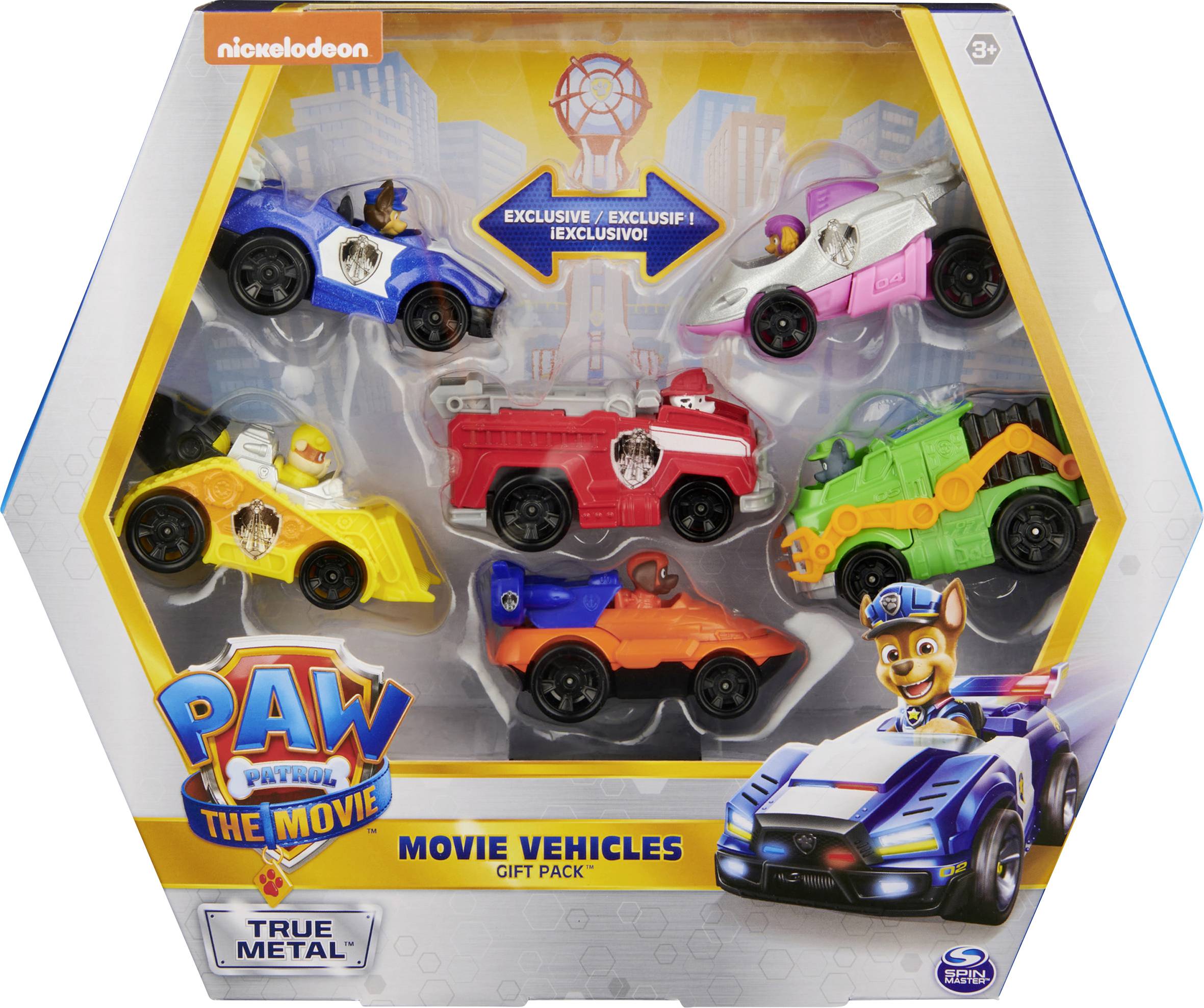Paw Patrol rast schneller als je zuvor zur Rettung mit den Paw Patrol: Der Kinofilm Metall-Fahrzeugen (gefertigt aus Spritzgussmetall). Das Geschenkset mit den Fahrzeugen aus dem Film enthält sechs Metallfahrzeuge im Maßstab 1:55, darunter exklusive Metallversionen der Fahrzeuge von Chase und Skye, die es sonst nirgends gibt. Mit authentischen Filmdetails und Grafiken, funktionierenden Rädern und Druckgussmaterial sehen die True Metal-Fahrzeuge genauso aus wie die eleganten Stadtfahrzeuge der Paw Patrol auf der großen Leinwand. Die Fahrzeuge lassen sich von Hand schieben oder für Hochgeschwindigkeitsabendeuer wie im Film starten. Jeder Welpe ist in seinem Fahrzeug verankert und die Ohren flattern im Wind, während sie zur Rettung eilen. Die Geschenkpackung zum Film ist die perfekte Gelegenheit, alle True Metal-Filmfahrzeuge zu sammeln, und ein toller Start oder eine gute Ergänzung für jede Paw Patrol True Metal Kollektion. Mit so vielen Paw Patrol True Metal-Fahrzeugen zum Sammeln, von Classic bis zu Sea Patrol, können Kinder alle ihre Lieblingsfahrzeuge aus der Serie und dem Film genießen. Außerdem können sie ihre Kollektion kinderleicht im Auge behalten, indem sie den QR-Code auf der Rückseite der Verpackung scannen, um das Sammelposter zu sehen. Jedes Paw Patrol: Der Kinofilm True Metal-Fahrzeug ist etwa 8,4 x 3,8 x 4,6 cm (LxBxH) groß. Paw Patrol True Metal-Spielzeug für Jungen und Mädchen sind das perfekte Geschenk für Kinder. Noch mehr Missionen und Rettungen aus dem Film bietet das True Metal Total City Rescue Set (separat erhältlich). Das Paw Patrol – The Movie mit dem Paw Patrol True Metal-Geschenkset bringt die Spannung des Films nach Hause.