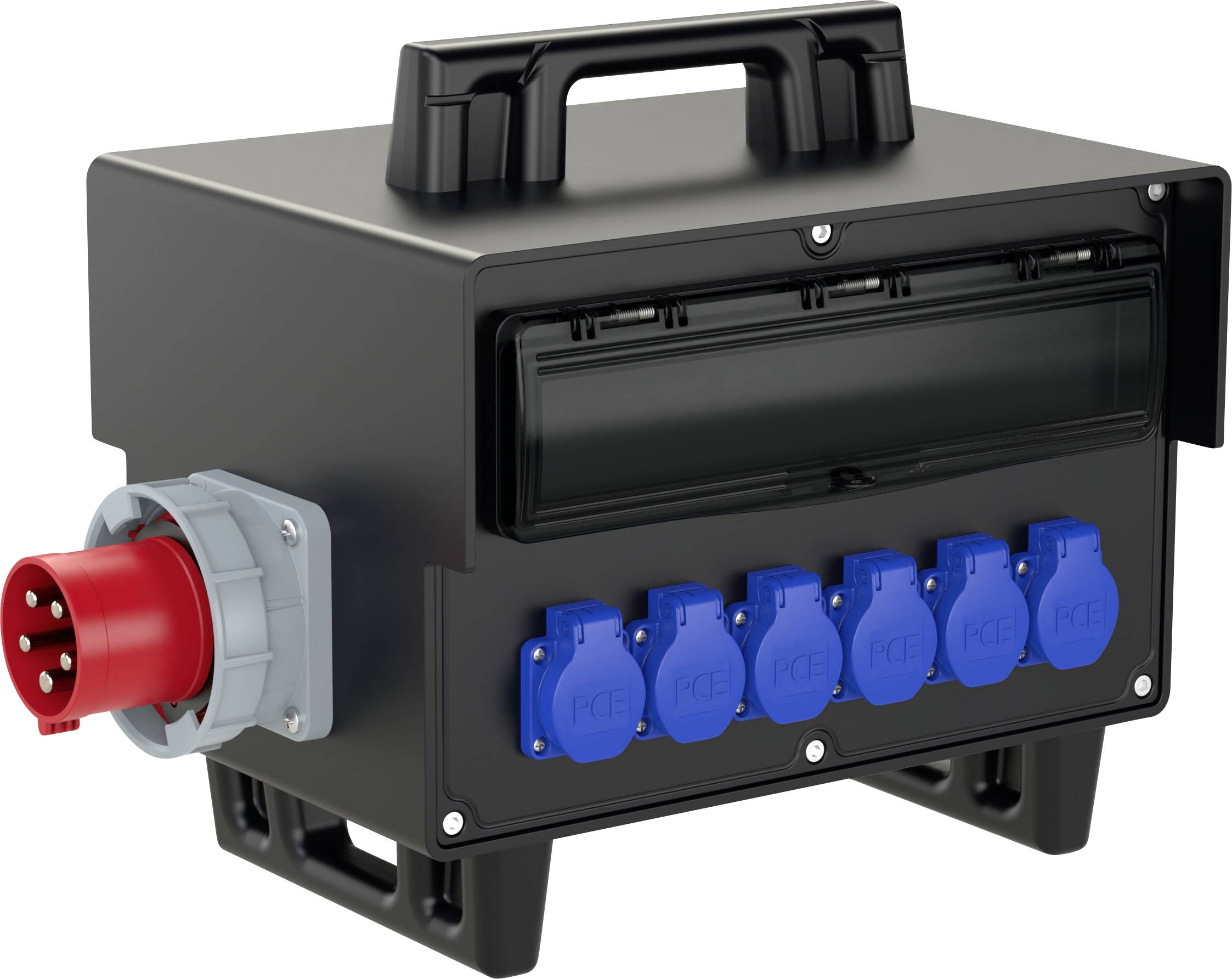 Mobilverteiler Vollgummi Baureihe SCHREMS BV 2x32/5 4x16/5 6xSSD GS63/5 Ea IP54, mit 1x Tragegriff oben und 2 x Stellfüße unten (stapelbar).