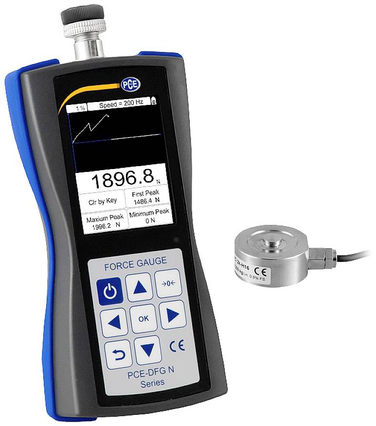 Dynamometer PCE-DFG NF 2K mit externer Kraftmessdose, USB-Schnittstelle und PC Software Der Dynamometer mit einer externen Kraftmessdose ist für die Messung von Druckkräften an schwer zugänglichen Messstellen ausgelegt. Die Druckmessdose ist durch ein ca. 3 m langes Sensorkabel mit dem Dynamometer verbunden und dank der geringen Zellenabmessungen sichert es eine vielseitige Einsatzmöglichkeit. Der Dynamometer bzw. die Kraftmessdose besitzt auf der Unterseite mehrere Gewindebohrungen, die eine feste Montage ermöglichen. Der Dynamometer kann mit einer Abtastrate von bis zu 1600 Hz arbeiten. Die abgetasteten Messwerte werden als Momentanwert, sowie in einem grafischen Messkurvenverlauf direkt im Dynamometer dargestellt. Die Messungen können im internen Speicher abgelegt werden oder per USB Schnittstelle mit der im Lieferumfang befindlichen Software mit maximal 800 Hz als Live Messung übertragen werden. Die PEAK Hold Funktion ermöglicht das Einfrieren des höchst gemessenen Messwertes im Dynamometer bis dieser Wert überschritten oder gelöscht wird. Der Dynamometer bietet die Möglichkeit zwei Grenzwerte zu hinterlegen, die kontinuierlich mit dem Momentanwert verglichen werden. Beim Über- bzw. Unterschreiten dieser Grenzwerte erfolgt ein Signal in der Anzeige des Dynamometers, sowie eine Reaktion über externe Schnittstellen, die z.B. für die Steuerung einer Prüfmaschine verwendet werden können.