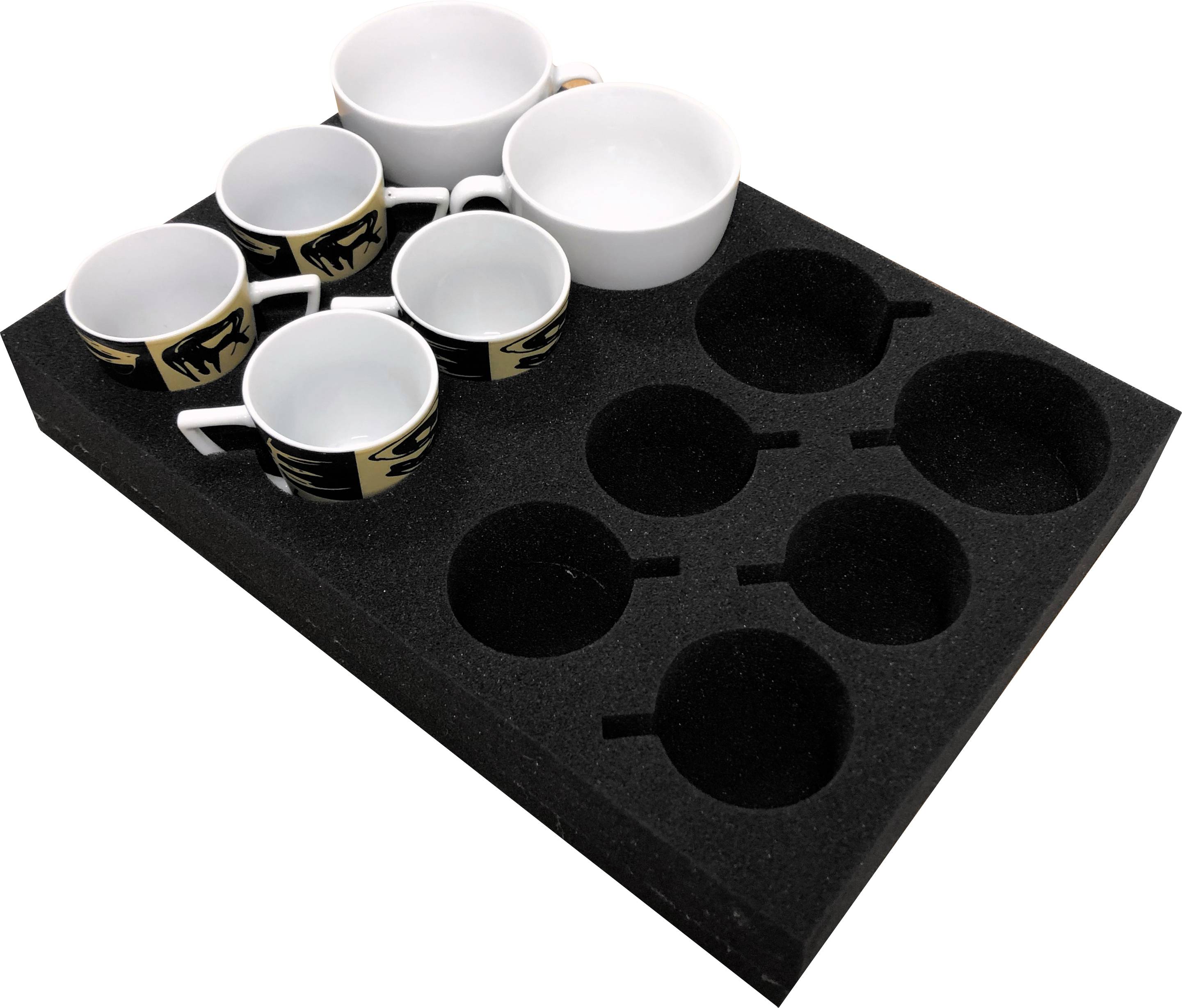 Universeller Glas- / Tassenhalter geeignet für 12 läser/Tassen besteht aus Schaumststoff. Ideal zum Transportieren und Lagern ohne Klappern sowie Schutz vor Bruchgefahr während der Fahrt. Die Haltervertiefungen mit unterschiedlichen Durchmessern passend für die meisten Gläser und Tassen in den gängigen Standardgrössen. Aussparungen für Tassenhenkel in den einzelnen Halterungen sorgen für idealen Sitz. Durchmesser der Aussparungen: ca. 4 x 7,5 cm und 8 x 6 cm.