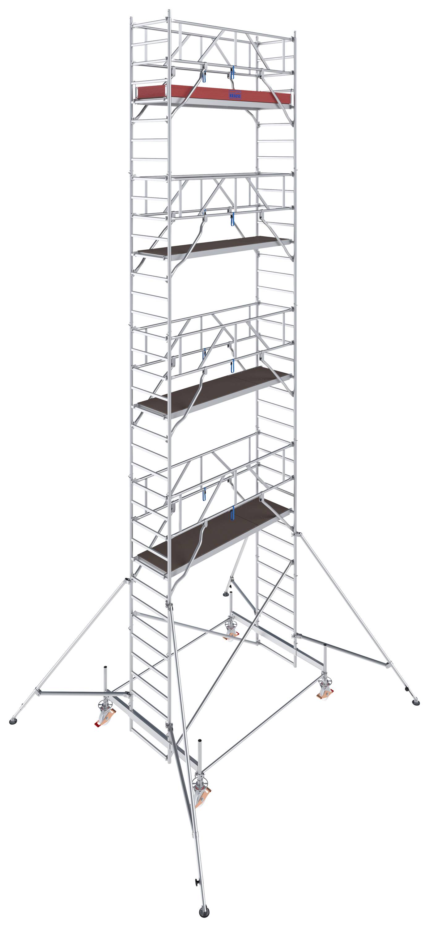 Leicht zu montierende Ausleger mit stufenlos teleskopierbarem Schwenkfuß (Verstellbereich bis zu 230 mm) sorgen ab einer Arbeitshöhe von 7,50 m auf jedem Untergrund für eine sichere Abstützung und Stabilität für große Höhen