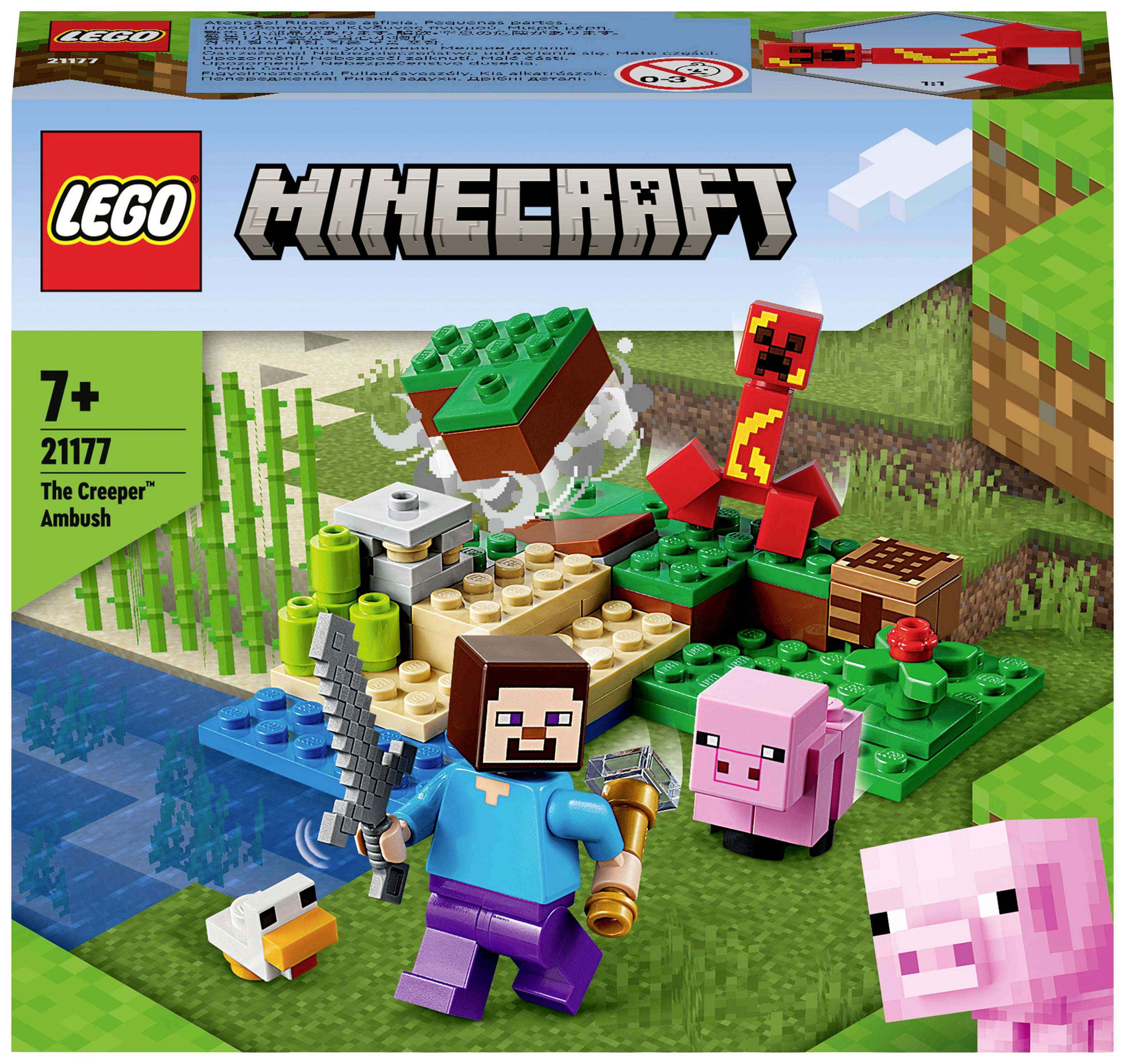 Das LEGO Minecraft-Set „Der Hinterhalt des Creeper“ (21177) ist vollgepackt mit Minecraft-Figuren, Zubehör und Details und inspiriert zu endlosen fantasievollen LEGO Minecraft-Abenteuern. Dieses kompakte, klassische Minecraft-Spielzeug, das mit LEGO Steinen zum Leben erweckt wurde, bietet Kindern endlose Spielmöglichkeiten. Steve, eine der Hauptfiguren des Spiels, wird von weiteren Minecraft-Figurenbegleitet: einem Schweinchen, einem Küken und einem explosiven Creeper.
