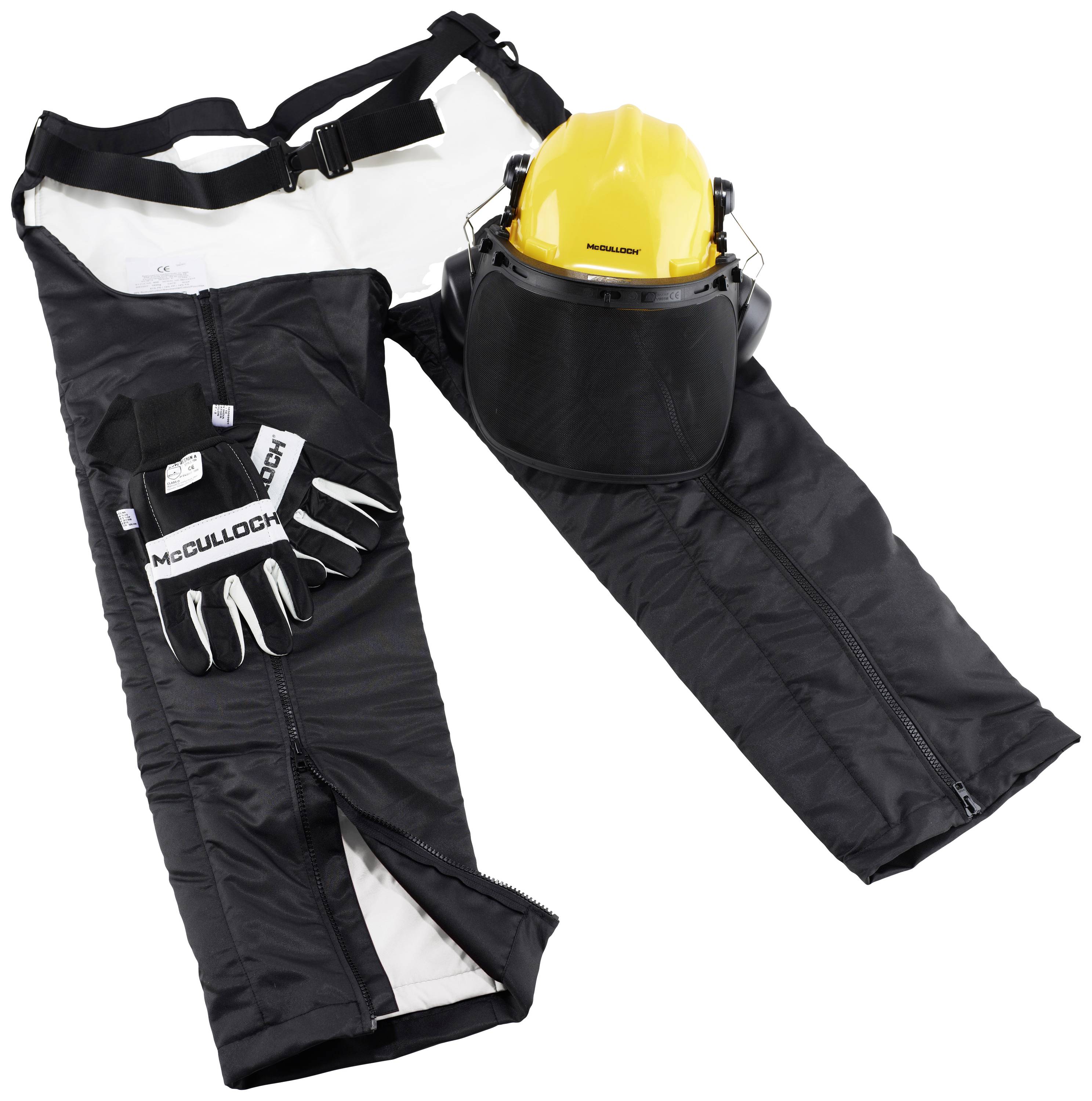 Universal Kettensägen-Schutzset für Arbeiten mit Kettensägen, bestehend aus Forsthelm, Schnittschutz-Beinlingen und Schnittschutz-Handschuhen.