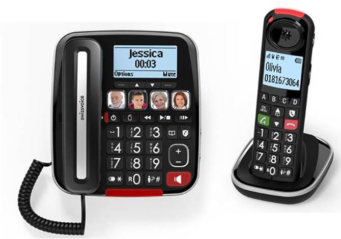 Kombi-Set aus schnurgebundenem Telefon mit Anrufbeantworter und schnurlosem DECT-Telefon mit Bildwahltasten und Hörverstärkung.