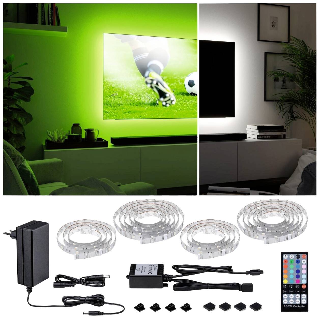 Spektakuläre Lichteffekte im Wohnraum, das MaxLED 250 TV-Comfort-Set RGBW mit Power Supply, LED-Stripes und Fernbedienung sorgt für eine indirekte Beleuchtung hinter dem Fernseher. Die komfortable Steuerung ermöglicht kinderleicht die direkte Farbwahl oder die Einstellung eines angenehmen gemütlichen Lichts durch die zusätzliche warmweiße LED. Praktisch: Durch die eigene Stromversorgung kann auch das Licht auch unabhängig vom TV eingeschaltet werden. Das Set ist mit seinen Stripe-Abschnitten und den - filigranen Ecken speziell auf einen 75 Zoll TV ausgelegt. Flexibel für jede Gehäuse-Form: Die extra lange Zuleitung und die Möglichkeit an allen - Ecken oder zwischen den einzelnen Stripes einzuspeisen, ermöglichen eine komfortable Verlegung am Rand der TV-Rückseite. Dank Kleberücken und Stecksystem ist die Montage sehr leicht und werkzeuglos durchzuführen.