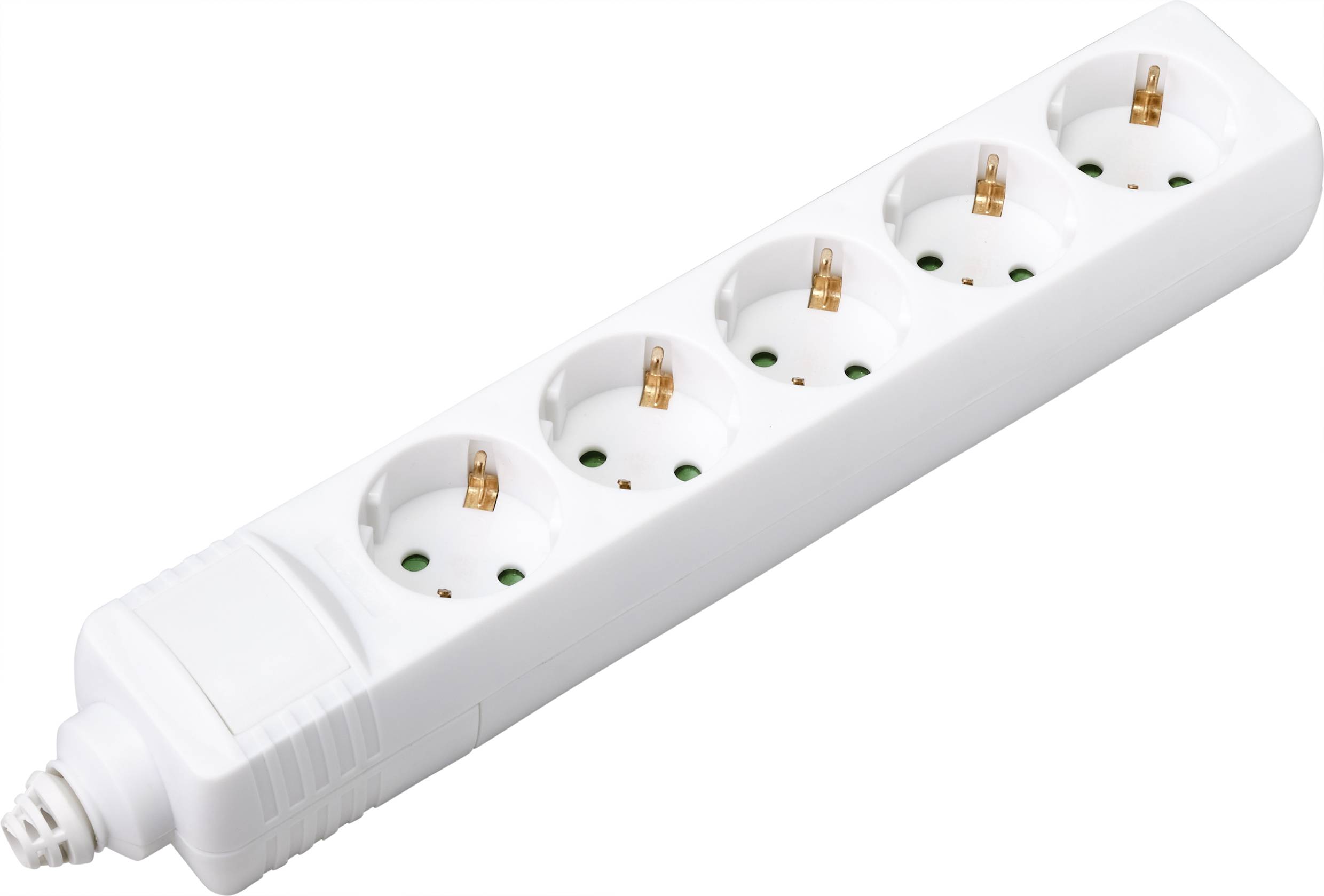 Diese Stromleiste ohne Kabelzuleitung bietet Schutzkontaktanschlüsse für bis zu fünf elektrische Geräte, und diese Steckplätze können auch tatsächlich alle genutzt werden: Die Buchsen sind um 45° verdreht auf der Leiste angebracht, damit sich abgewinkelte Schutzkontaktstecker nicht gegenseitig in die Quere kommen. Die Kontaktbuchsen sind darüber hinaus mit einem erhöhten Berührungsschutz versehen: Schutzklappen verhindern das unbeabsichtigte Berühren der Leitungen, denn die innenliegende Drehflügel-Sicherung öffnet sich nur bei gleichzeitigem Druck auf beide Kontaktöffnungen.