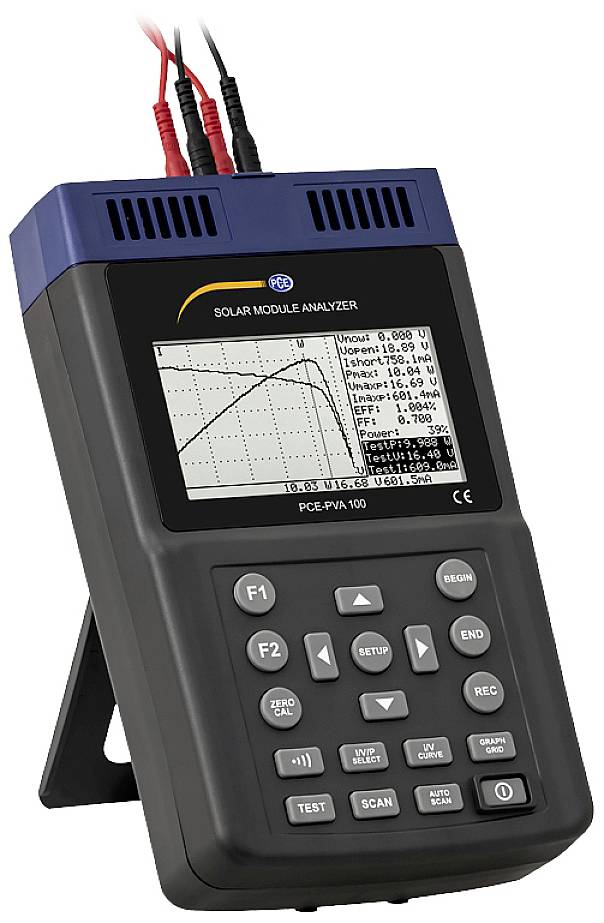 Solarmodul Tester mit einem Messbereich von 0 - 12 A DC, USB Schnittstelle, Datenspeicher für 100 gemessene Kennlinien, 4,8" LC Display, Akku Betrieb für ca. 400 Messungen, optional mit ISO Kalibrierzertifikat. Der Solarmodul Tester ist ein nützliches Hilfsmittel um Solarzellen auf ihre Kennlinien hin zu untersuchen. Mit einem Gleichspannungsbereich von 0 - 60 V und einem Gleichstrombereich von 0 - 12 A deckt der Solarmodul Tester eine große Anzahl von Solarmodulen ab. Gespeichert werden die ermittelten Kennlinien direkt auf dem Solarmodul Tester. Auf dem Datenspeicher vom Solarmodul Tester können bis zu 100 Messungen gespeichert werden. Die gespeicherten Messwerte können anschließend an einem PC mit der dazugehörigen Software ausgelesen und weiterverarbeitet werden. Zusätzlich besteht die Möglichkeit den Solarmodul Tester vollständig über die Software zu bedienen. Für die Bestimmung der Kennlinien eines Solarmoduls stehen bei dem Solarmodul Tester zwei verschiedene Messfunktionen zur Verfügung. Im automatischen Modus wird die Kennlinie mit automatischen Parametern vom Solarmodul Tester erstellt. Dadurch erhält der Bediener einen ersten Eindruck von dem Zustand von dem Solarmodul. Im manuellen Modus können bei dem Solarmodul Tester der Stromanfangswert und der Stromendwert eingestellt werden. Ist die Fläche des Solarmodules und die Leistung der eintreffenden Strahlung in W/m² hinterlegt, kann der Solarmodul Tester die Effizienz und den Füllfaktor der Zelle berechnen. Eine weitere Messfunktion bei dem Solarmodul Tester ist die Ein Punkt Messung. Hierbei kann ein spezifischer Strom vom Solarmodul Tester angesteuert und überprüft werden. Das LC Display bei dem Solarmodul Tester hat eine Größe von 4,8“. Dadurch kann die Kennlinie und gleichzeitig alle Messwerte abgelesen werden. Um die Kennlinie besser zu analysieren kann jeder einzelne Messpunkt bei dem Solarmodul Tester angefahren werden. Für eine andere Ansicht der X und Y-Achse kann per Tastendruck auf dem Solarmodul Tester zwischen Strom, Spannung und der Leistung umgeschaltet werden. Wegen seiner vielen verschiedenen Funktionen ist der Solarmodul Tester das ideale Messmittel, um Solarmodule auf deren Effektivität hin zu untersuchen. Der Solarmodul Tester findet daher seine Anwendung auf Photovoltaikanlagen und Forschungseinrichtung zur Weiterentwicklung von Solarmodulen. Optional kann der Solarmodul Tester mit einem ISO Kalibrierzertifikat ausgestattet werden.