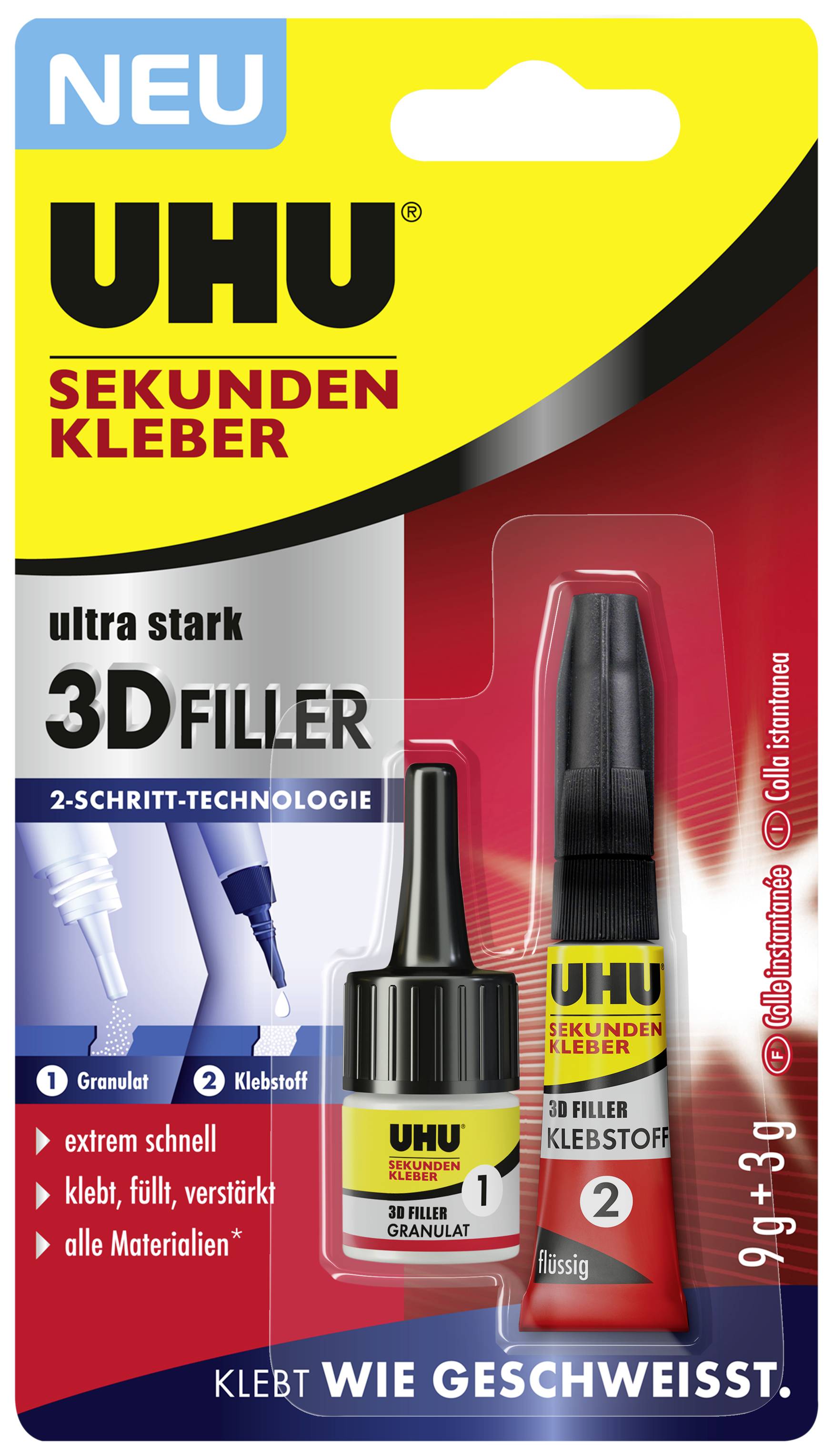 UHU Sekundenkleber 3D Filler ist ein ultra-starker, 2-stufiger Sekundenkleber