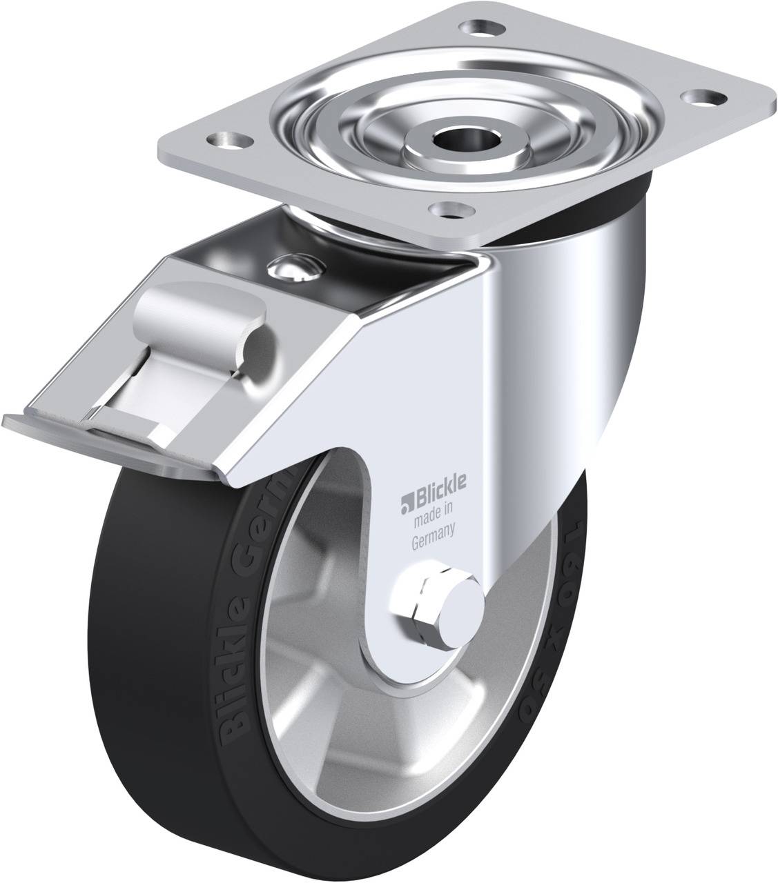• Reifen: hochwertiger Elastik-Vollgummi "Blickle EasyRoll" in Leichtlaufqualität, Härte 65 Shore A, Farbe schwarz