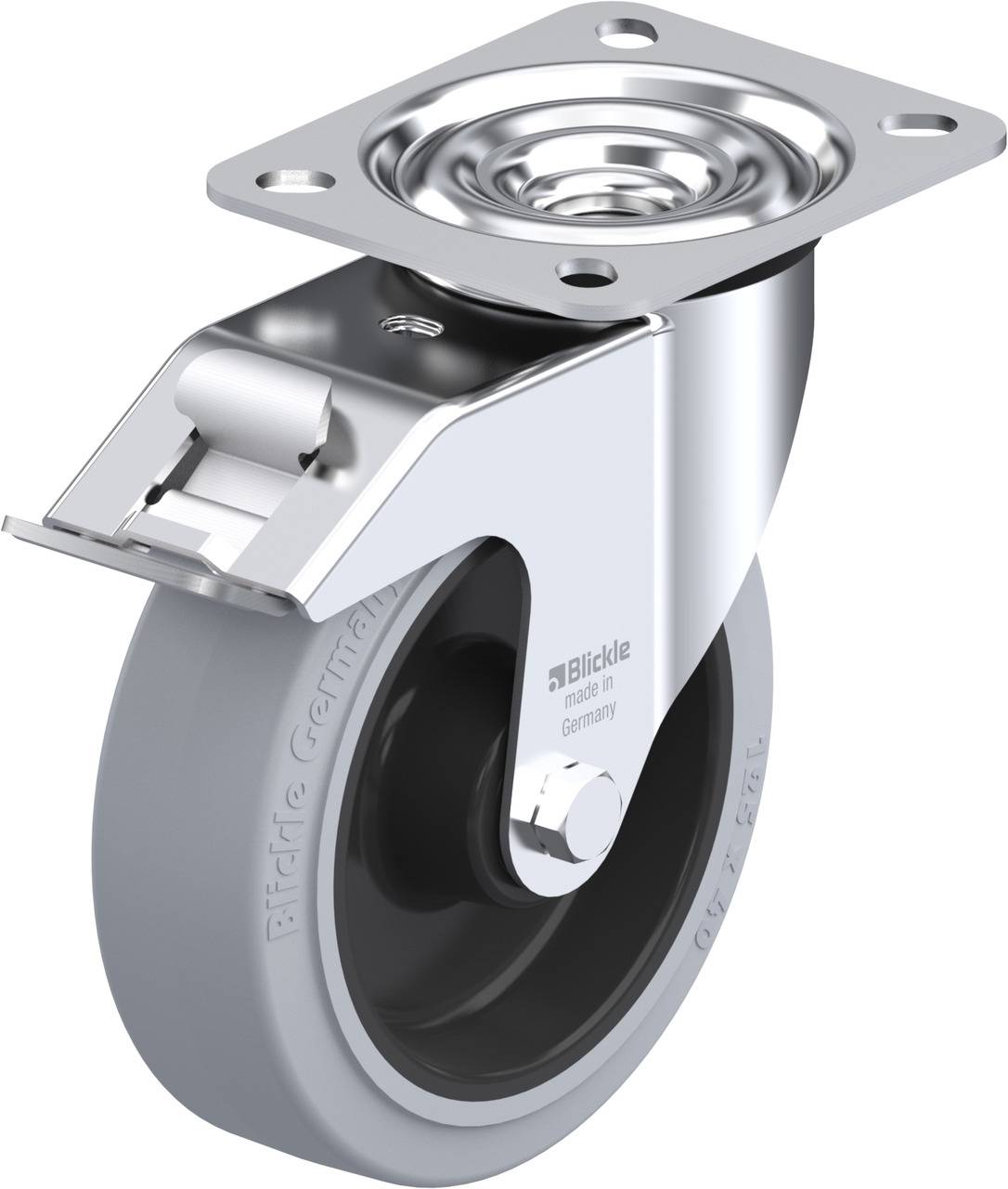 • Reifen: hochwertiger Elastik-Vollgummi "Blickle EasyRoll" in Leichtlaufqualität, Härte 65 Shore A, Farbe grau, spurlos