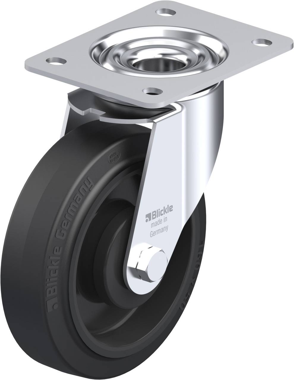 • Reifen: hochwertiger Elastik-Vollgummi "Blickle EasyRoll" in Leichtlaufqualität, Härte 65 Shore A, Farbe schwarz
