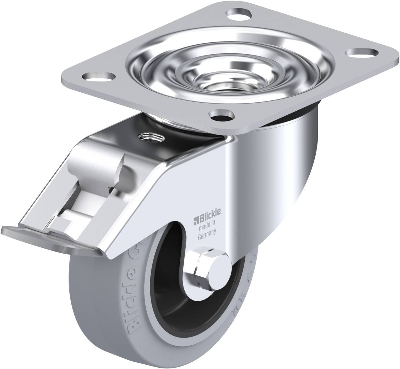 • Reifen: hochwertiger Elastik-Vollgummi "Blickle EasyRoll" in Leichtlaufqualität, Härte 65 Shore A, Farbe grau, spurlos