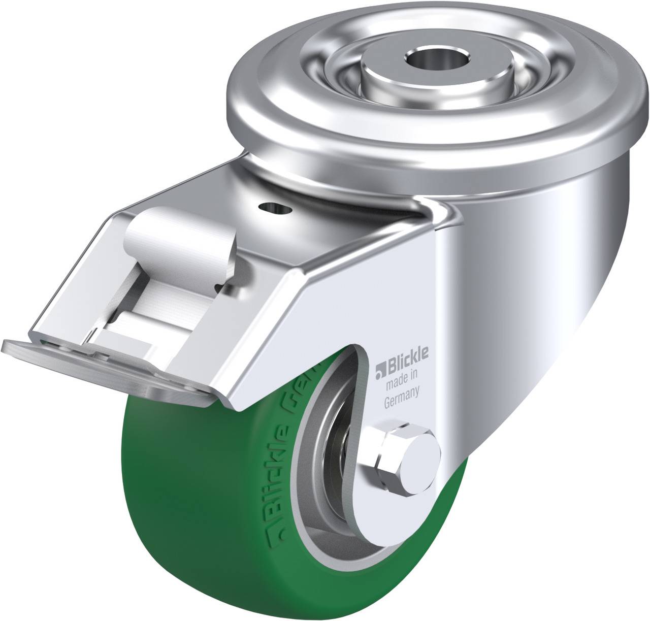 • Laufbelag: hochwertiges Polyurethan-Elastomer Blickle Softhane®, Härte 75 Shore A, Farbe grün, spurlos, kontaktverfärbungsfrei