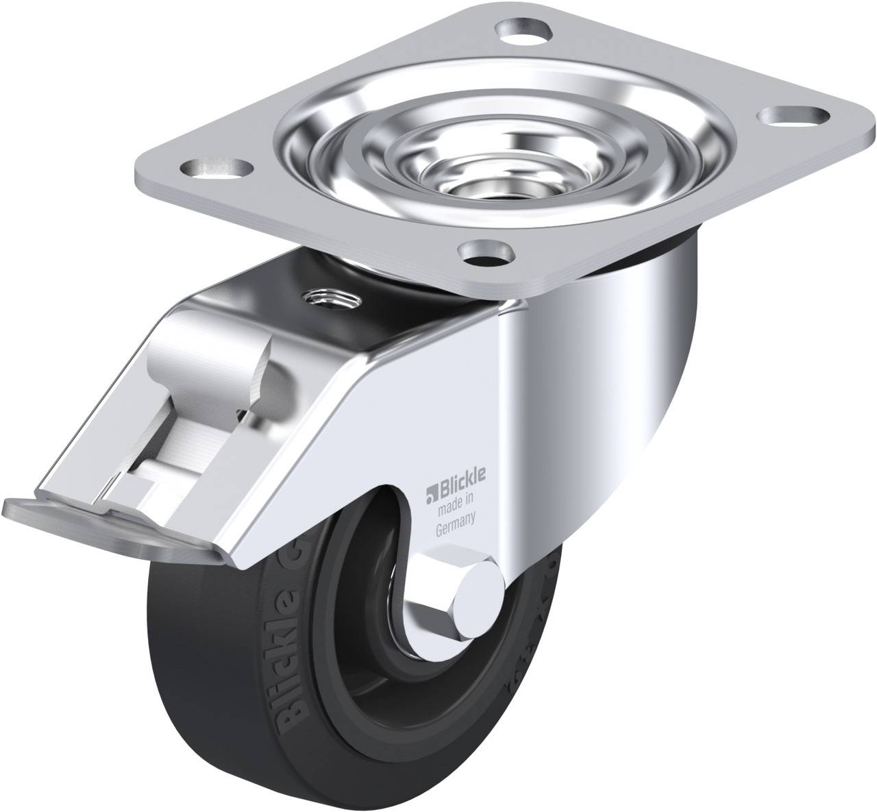 • Reifen: hochwertiger Elastik-Vollgummi "Blickle EasyRoll" in Leichtlaufqualität, Härte 65 Shore A, Farbe schwarz