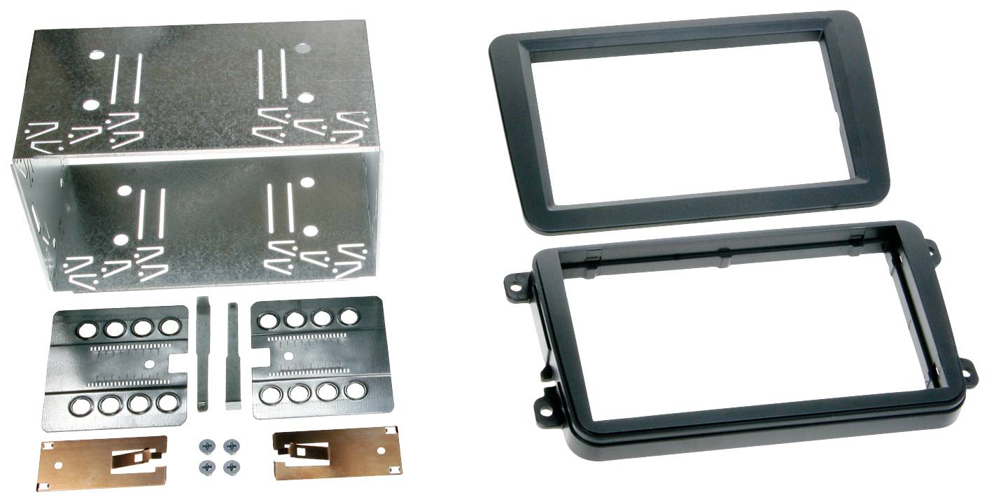 2-DIN Radioblende Seat / Skoda / VW Viele Autohersteller verbauen eigene fahrzeugspezifische Radios, die optisch an die Mittelkonsole angepasst sind. Aus diesem Grund benötigen Sie für den Austausch gegen ein handelsübliches DIN oder Doppel DIN Radio eine passende Radioblende. Außerdem werden oft auch noch fahrzeugspezifische Radioanschlusskabel, Antennenadapter, Lenkradfernbedienungsadapter, Kameraadapter und Aktivsystemadapter benötigt. Bei der richtigen Auswahl hilft unser Support-Team gerne weiter. 02431-9645-96 Für folgende Fahrzeuge geeignet: Seat Seat Alhambra (7N) 10/2010 - 2015 Seat Leon (1P/1PN Facelift) 03/2009 - 10/2012Seat Toledo (KG) 03/2013 - 2016Skoda Skoda Fabia (5J) 03/2007 - 06/2014Skoda Octavia II (1Z Facelift) 01/2009 - 02/2013Skoda Rapid (NH) 10/2012 - 2019*Skoda Roomster (5J) 09/2006 - 2015Skoda Praktik (5J) 04/2007 - 04/2015 Skoda Superb (3T4) 07/2008 -2015**Skoda Superb (3T5) 01/2010 - 2015**Skoda Yeti (5L) 08/2009 - 2017***VW VW Amarok (2H) 03/2010 - 2016VW Amarok (2HS2) 11/2011 - 2016VW Beetle (16/5C1/16/5C7) 11/2011 - 2016VW Beetle (16/5C7) 11/2012 - 2016VW Caddy (2K/2KN) 10/2003 - 2020VW Caravelle 09/2009 - 2015VW CC (3CC) 02/2012 - 2016VW EOS (1F) 05/2006 - 2015VW Golf V (1K) 11/2003 - 09/2008VW Golf V (1KM) 06/2007 - 10/2009VW Golf V Plus (1KP) 01/2005 - 02/2009VW Golf VI (1K) 11/2008 - 12/2012VW Golf VI (1KM) 11/2009 - 04/2013VW Golf VI (1K) 06/2011 - 2013VW Golf VI Plus (1KP) 03/2009 - 01/2014VW Jetta V (1KM) 09/2005 - 10/2010VW Jetta VI (16) 01/2011 - 2015VW Multivan 09/2009 - 2015 VW Passat B6 (3C2) 11/2005 - 07/2010VW Passat B6 (3C5) 08/2005 - 07/2010VW Passat B7 (3C/362) 11/2010 - 10/2014VW Passat B7 (3C/365) 11/2010 - 10/2014VW Passat B7 (3C/365) 01/2012 - 10/2014VW Passat CC (3C/3CC) 05/2008 - 01/2012VW Polo (6R) 06/2009 - 03/2014VW Scirocco III (13) 08/2008 - 2014VW Sharan II (7N) 09/2010 - 2021VW Tiguan (5N) 09/2007 - 2016VW Touran (1T) 02/2003 - 2015VW T5 Transporter 09/2009 - 2015 VW T6 2015 - 2019**** Farbe: schwarz Einbauausschnitt Radiodisplay: 172mm x 98,5mm * Unter Umständen muss eine OEM-Skoda Blende bestellt werden: 5JA858 415 9B9 **Fahrzeuge mit Swing OEM Gerät OEM-Skoda Blende: 3TO8580691QB (Blende COLUMBUS Navi)*** Unter Umständen muss eine OEM-Skoda Blende bestellt werden: 5L0858069L1 QB ****OEM Geräteabdeckung im mittleren Bereich mit Werkstattmitteln anpassen Optional: Ablagefach für 2-DIN Blenden 2 teilig: 271000-06