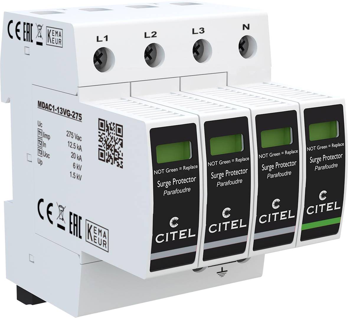 4-poliger (3+1), modularer Kombiableiter Typ 1+2+3 auf Funkenstreckenbasis zum Einsatz in der Hauptverteilung, nach VDN-Richtlinie im Vorzählerbereich einsetzbar.