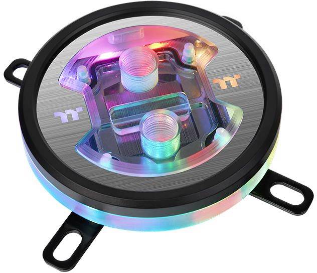 A copper base CPU water block with 0.15mm internal fin construction, anti-corrosive nickel plating and a built-in temperature sensor for monitoring temperature and high standard cooling performance. Supported by TT RGB Plus Software delivering 16.8 million colors of illumination.