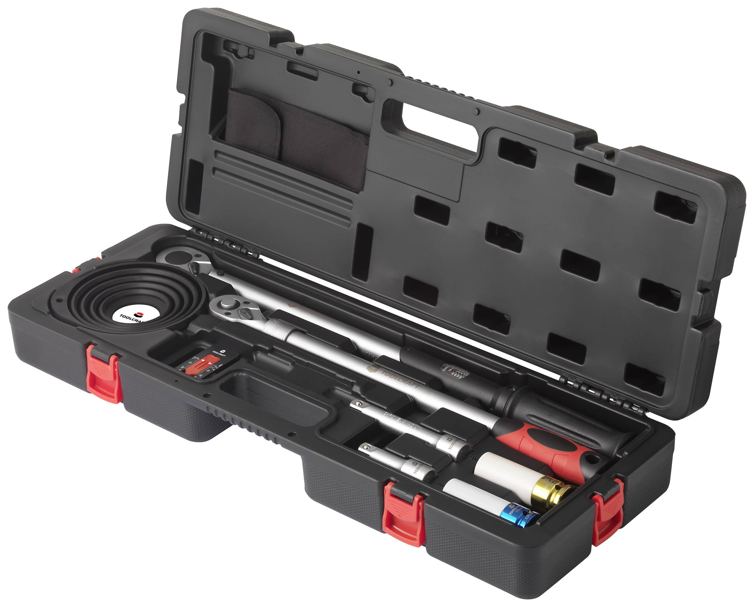 Enthält einen Profi-Drehmomentschlüssel mit 40 - 210 Nm, eine Profi-Teleskop-Ratsche 460 bis 600 mm und 2x dünnwandige Schlagschraubereinsätze: 17 & 19 mm