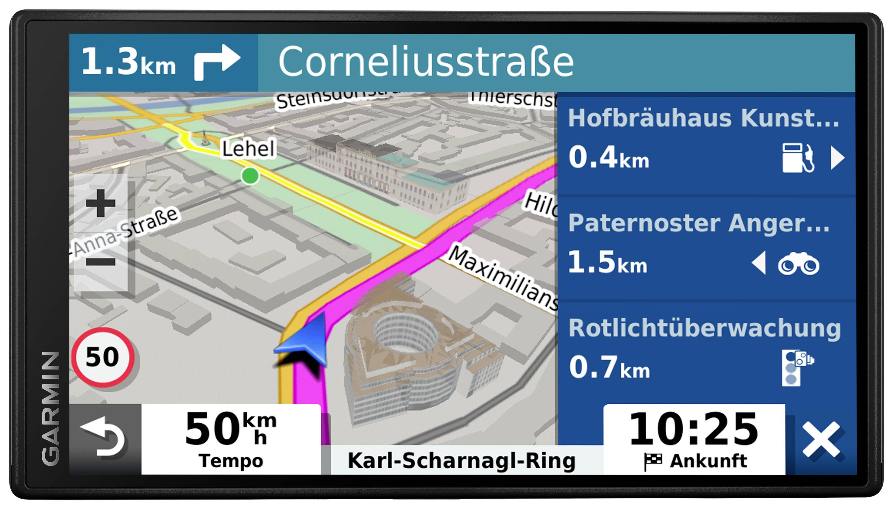 Mit Abbiegeansagen anhand sichtbarer Orientierungspunkte verfügen Garmin Navis über eine besonders klare Routenführung. Die Namen von Straßen, Geschäften und gut erkennbaren Orientierungspunkten dienen z. B. als Anhaltspunkte.