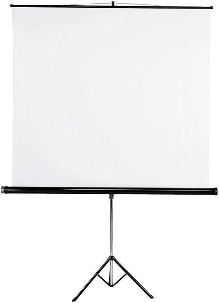 Schwarzer Metalltubus mit einem Durchmesser von ca. 7 cm · Optimale Planlage der stufenlos ausziehbaren Leinwand durch Spannvorrichtung am Tubus · Lichtbildwand um 360° Grad drehbar · Kunststoff-Tragegriff mit Arretierknopf · Standsicheres Dreibeinstativ mit rutschfesten Kunststoff-Fußkappen.
