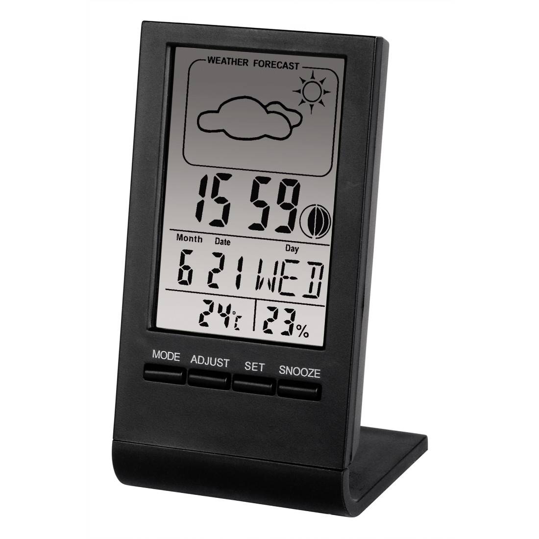 Für digitale Anzeige von Temperatur, Luftfeuchtigkeit, Uhrzeit, Wochentag, Datum. Transparentes LCD-Display. . Thermometer:. Umschaltbar zwischen Grad Celsius und Fahrenheit. Speicherung der min./max. Werte für Temperatur. Hygrometer. Speicherung der min./max. Werte für Luftfeuchtigkeit. Barometer. Wettervorhersage (sonnig, leicht bewölkt, wolkig, regnerisch). . Uhr-/Kalenderfunktion:. Uhrzeit (umschaltbar 12-/24-h-Format). Datum- und Wochentaganzeige. Alarmfunktion. Zusatzfunktion:. Mondphasenanzeige. Technische Eigenschaften:. Außensensor: Nein. Datenspeicher: Ja. DCF-Funkuhr: Nein. Farbdisplay: Nein. Hygrometer: Ja. Luftfeuchtigkeit (innen): 20% - 99%. Messbereich (außen): -50°C bis +70°C. Thermometer: Ja. Weckfunktion: Ja. Wettervorhersage: Ja. Zusatzfunktionen: Mondphasenanzeige. Anzahl Batterien Station: 1. Batterietyp Station: LR1120L. Farbe: Schwarz