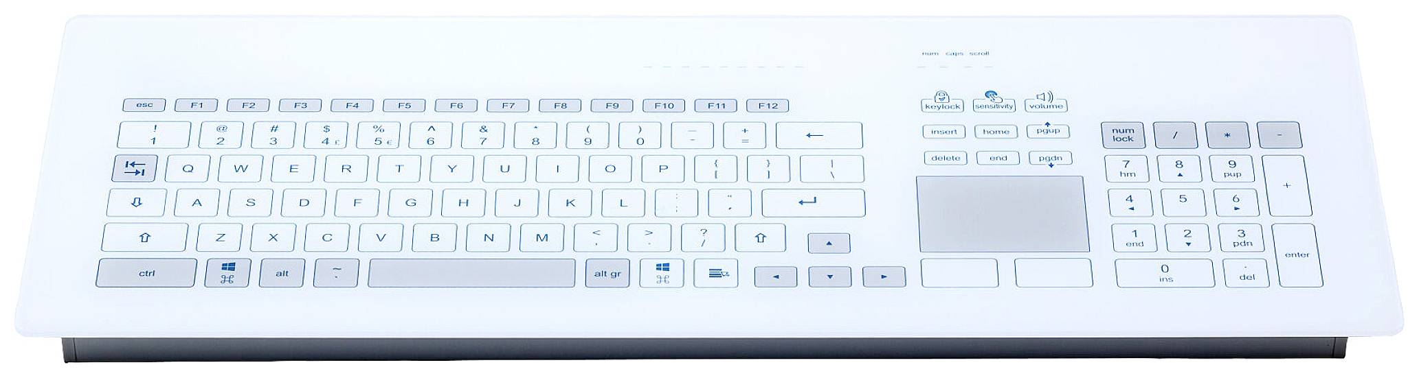 Diese Glastastatur ist zum Einbau in designorientierten und hygienesensiblen Umgebungen konzipiert. Sie lässt sich problemlos in Panels aus Metall, Kunststoff oder Holz durch Einkleben integrieren. Durch Verwendung von drei Millimeter gehärtetem Weißglas ist sie robust und langlebig. Ihre vollkommen flache Oberfläche lässt sich leicht und gründlich reinigen und desinfizieren. Die Tastatur besitzt ein vollständiges alphanumerisches Tastenset mit integriertem Touchpad.