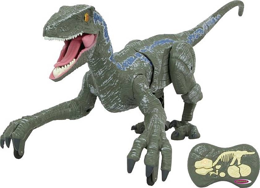Ein kleiner Dinosaurier der ferngesteuert auf dem Boden fahren kann. Dabei sieht der fast 50 cm lange Velociraptor aus als würde er schnell laufen. Die Bewegungen der Beine und des Körpers wirken so realistisch das man tatsächlich den Eindruck bekommen könnte man hätte ein kleines Haustier. Unterstützt durch Dinosauriergebrüll macht das Modell durch bedienen der Fernsteuerung flinke Bewegungen. Also, Akku laden und dann mit dem Saurier ab auf den Teppich- ein Spaß für Groß und Klein.