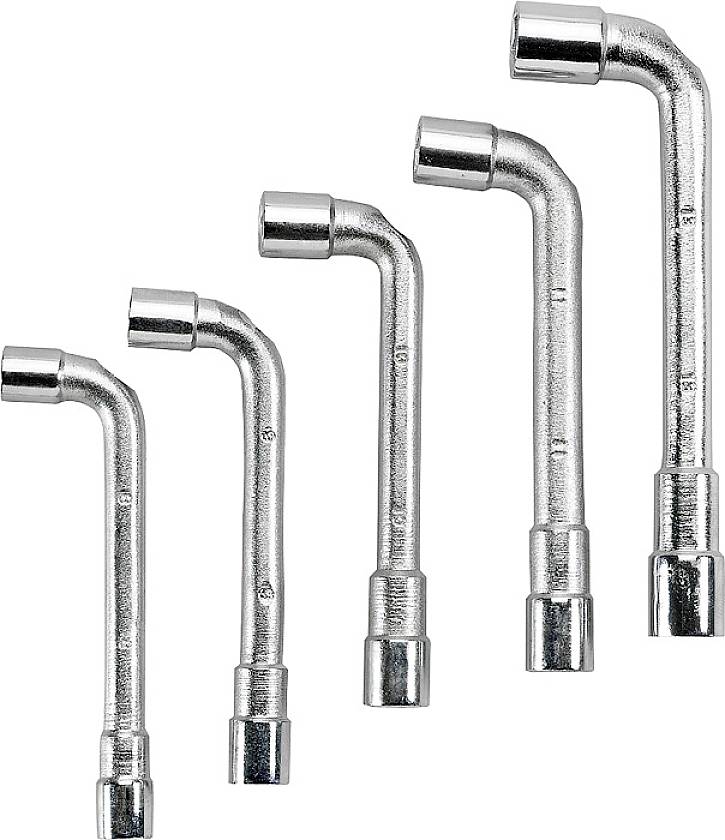 matt verchromt, beide Seiten gleiche Schlüsselweiten, im Griff spezielle Hohlform mit 6-kant-Profil, der kurze Kopf ist durchbohrt für vorstehende Gewinde und Dorne, mit Wellenprofil, geeignet für das Arbeiten an Stehbolzen und Gewindestangen