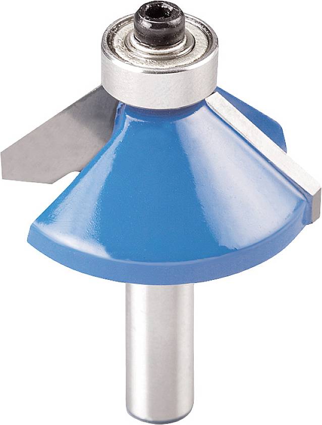 Fasenfräser, hartmetallbestückt, 2-schneidig, Schneiden präzisionsgeschliffen, zum Anfasen von Kanten an regelmäßigen oder geschweiften Werkstücken, für Hart- und Weichholz sowie Plattenwerkstoffen, für alle handelsüblichen handgeführten Oberfräsen.