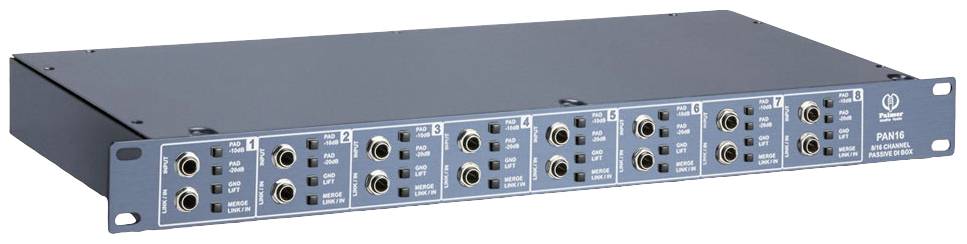 Die Palmer PAN16 ist eine 8-kanalige passive DI-Box im 19" Rackformat mit 1 HE. Durch die besondere MERGE LINK/IN-Funktion kann der vordere LINK-Ausgang zum Durchschleifen des Signals als zweiter Eingang geschaltet werden, dessen Signal mit dem der INPUT-Buchse als Monosumme an den Ausgang geführt wird. So bietet die PAN16 maximal 16 Eingänge, zwei PAD-Taster ermöglichen 10, 20 und 30 dB Dämpfung. Die Ausgänge sind als XLR-Buchsen ausgeführt und durch Übertrager galvanisch getrennt und symmetriert. Darüberhinaus befinden sich 8 zusätzliche LINK-Buchsen auf der Rückseite des Geräts.