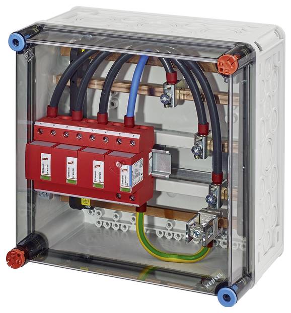 Funktionsgehäuse als Überspannungsschutzgehäuse mit 1 x Überspannungsableiter Typ 1+2. Deckelverschlüsse für Werkzeugbetätigung.