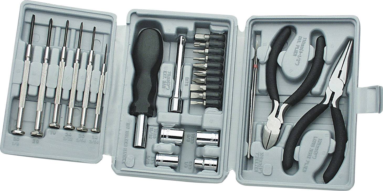 Seitenschneider (115 mm) · Spitzzange (130 mm) · Spitzpinzette (Metall) · 10 Bits (6,3 mm (1/4")) · 3 Schlitzbits (4/5/6 mm), je 2 Kreuzschlitz-PH/PZ-Bits Größe 1/2, 3 Vielzahn-Bits T10/T15/T20 · Bits-Umsetzer von Vierkant (6,4 mm) auf Sechskant · 4 Sechskantnüsse 7/8/9/10 mm · Verlängerung 75 mm · 1 Bit-Schrauber · 4 Schlitzschrauber Breite 1,2/1,6/2,0/3,2 mm · 2 Kreuzschlitzschrauber (Gr. 0/1) · Kunststoffbox.
