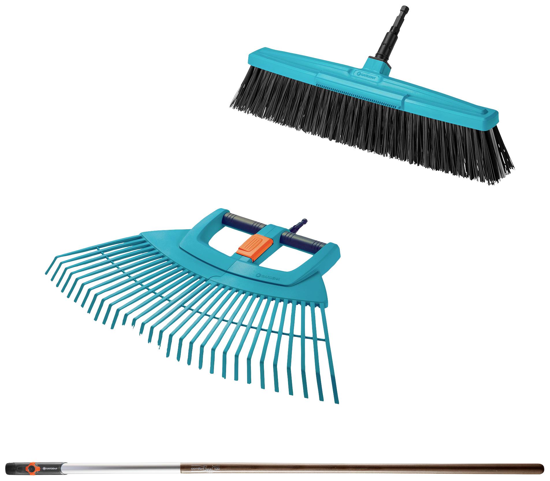 Lieferumfang beinhaltet: 1x Gardena combisystem-Kunststoff-Fächerbesen XXL vario, 1x Gardena combisystem-Straßenbesen, 1x Gardena combisystem-Holzstiel 130 cm