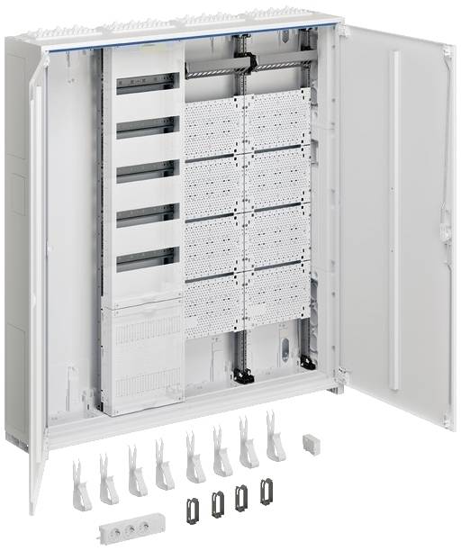 Systemschrank,Multimedia, universZ,1100x1050x205mm, SKII, IP44, VF-5rh/APZ,4feld. Zählerschranklösung Schrankgehäuse nach DIN VDE 0603/1, Maßnorm DIN 43 870 zur Aufputz, Unterputz oder teilversenkter Montage. Bestehend aus Schrank mit Tür aus pulverbeschichtetem, eingebranntem, stabil profiliertem 1 mm dickem Stahlblech. Innenauskleidung komplett aus Kunststoff. Leitungseinführungen oben und unten durch eingebaute Kunststoffflanschplatten. Rückseitige Vorprägung im Kunststoffteil. Sammelschienendurchführungen als beidseitige seitliche werkzeuglos zu öffnende Flansch im unteren Bereich als Möglichkeit zur Sammelschienenverbindung von verschiedenen Schränken oder in Verbindung mit einem Kabelanschlusskasten und Anschlusssatz. Neben der Durchführung im NAR zusätzlich Öffnungen im Bereich des AAR (für Bauhöhe 1100 und 1400 mm) und RfZ (für Bauhöhe 1100mm). Tür frontbündig mit innenliegenden, justierbaren Scharnieren, wahlweise rechts oder links anschlagbar mit 110° Öffnungswinkel. Türverschluss mit Vorreiber. Türverschluss durch andere Schließungen austauschbar. Schrank nebeneinander und übereinander anflanschbar. Schrankgröße 1- bis 5-feldrig mit 72 bis 540 Platzeinheiten (PLE). Hinweis: Die Hauptleitung ist nach VDE-AR-N 4100:2019-04 von unten oder seitlich in den unteren Anschlussraum des Zählerschrankes einzuführen und dort anzuschließen. Höhe:  __  mm (1100mm oder 1400mm) Breite: __ mm Tiefe: 205 / 160 mm, RAL-Farbe: 9010 Schutzart 44, Schutzklasse II  Nennstrom des Sammelschienensystems 250 A Ausführung nach VDE-AR-N 4100:2019-04 Zähleranlage für __ Zählerplatz(e). Nach den technischen Anschlussbedingungen (TAB) des VNB __ für: __ Elektronische Haushalts-Zähler (eHZ) oder __ Zähler mit 3-Punktbefestigung (3HZ). __ für Bezugsanlagen mit haushaltsüblichem Verbrauch max. 63 A (10mm²) nach DIN 18015-1 ( __ Wohnungen, __ Allgemein, __ Reserve, __ Wärmepumpe) __ für Dauerstromanwendungen max. 32 A (10 mm²) nach VDE-AR-N 4100:2019-04 (z.B. PV bis 22 KW) __ für Dauerstrom
